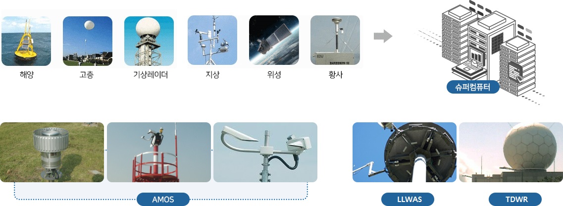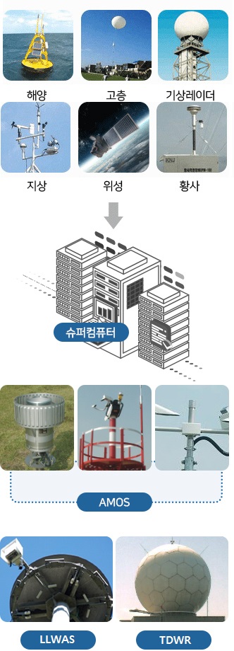 다양한 관측장비를 이용하여 지구를 감싸고 있는 대기의 상태를 입체적으로 측정하고 기상위성과 레이더 등을 활용하여 공기의 흐름과 성질을 파악한다. 수집된 관측자료는 기상예보용 슈퍼컴에 입력하여 다양한 예보자료를 생산한다.